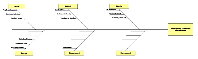 The first step in gap analysis is to observe the process in detail. Documenting the current state process utilizing a process map is a good way to get started with this process. The team may even do this as part of the problem definition process described in the last article. What's next? After the team has observed and documented the process, a fishbone or cause and effect diagram might be the best next step. The fishbone diagram is drawn to resemble the skeleton of a fish, with the issue (problem or process condition) on the right side. The major cause categories are written in the boxes on the left side of Cause and Effect Diagram. Summarize the major causes under the categories. The basic categories are usually people, methods, machines, and materials. Sometimes, other categories such as measurements and/or environment are added. The step by step process is: