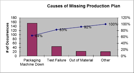 - Have some Collect relevant data by category. For example, in the pareto chart below, a check sheet with causes for not meeting the planned production for the day was created, and the operators checked off each occurrence in which one of the failures occurred by category.