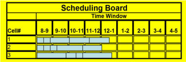 2. Scheduling Board: Scheduling boards can also be used to facilitate leveling product volume and mix. Scheduling boards dictate the sequence and timing of product. In figure 3, each blue “card” or magnet represents a work order or build quantity. The length of the card corresponds to the time it should take to build these units using standardized work. A card is pulled when the next job is ready to start. By looking at this board we can observe whether or not our process running on-time and whether or not we need to add resources or work overtime. This is another example of utilizing the concept of management time frame.