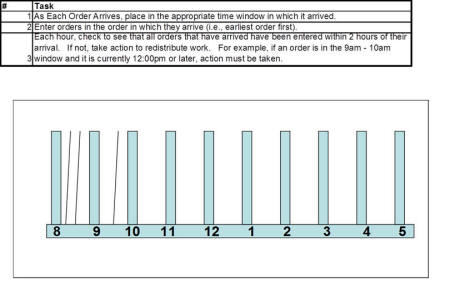 3. FIFO Lane (office example) - A FIFO (First-In-First-Out) lane is a visually apparent and physically limiting area containing a defined limited quantity of parts, jobs, or units of work in sequence. The supplying process dictates the sequence of work; the customer or downstream process builds in this identical sequence. A FIFO lane helps level work because it ensures the proper sequence of work (for leveling mix) and it limits the quantity of work. It serves as a visual tool to prevent too much (or too little work). The concept in Figure 4 connects the customer with a customer service department. As orders arrive from the customer, each order is placed in the time window in which it arrives. Orders are processed in FIFO. Each hour, these visual FIFO lanes are checked to ensure that all orders have been entered within a 2 hour time period (a service level set by the customer service department). If there are two many orders, the team leader takes action to redistribute work and determine the cause.