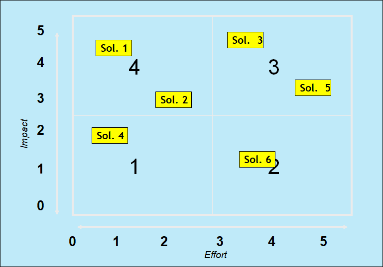 After we understand the critical causes it is time to develop countermeasures that specifically address these causes. This should be a collaborative process. In team problem solving workshops, I generally recommend using a silent brainstorming method. In the age of COVID-19, this can also be done virtually using Chat, as long as the rules of brainstorming are followed. Silent brainstorming typically requires team members to write down their ideas- 1 per sticky note- and then place these sticky notes on a whiteboard in front of the room. The ideas will later be discussed and ranked based on some criteria. The most basic approach is to rank the ideas based on Effort and Impact using an Impact / Effort matrix shown in the figure below. Ideas that have largest impact and least effort are prioritized starting in the upper left of the diagram. From this diagram, the team can create an action plan for testing and implementation.